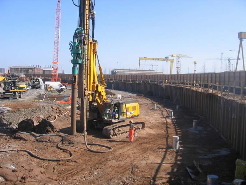 Excavations for both basements required the removal of some 51,000 m3 spoil, of which 19,000 m3 was contaminated and required removal to a designated remediation area within the Titanic Quarter. A total of some 2,500 Nr. 450mm dia. bored concrete foundation piles were installed below the basement floors by DAWSON-WAM leader rig systems.