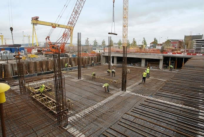 For construction of both basements, closed sheet piled cofferdams were required for excavation support and to exclude high ground water with extensive tidal influence. Ground water was also contaminated and required an extensive dewatering system inside the cofferdam. The whole area, having previously been used by Harland and Wolff for industrial purposes, required the breaking up and removing/recycling of large areas of concrete slabs, foundations, tanks and bases.