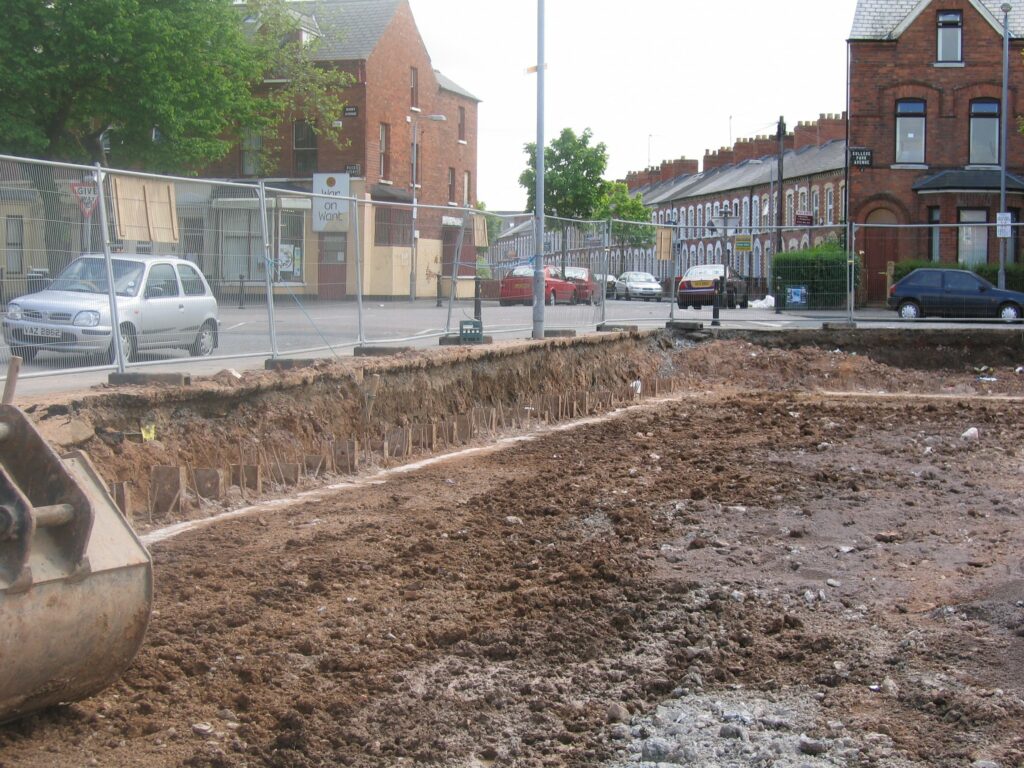 Our design consisted of reinforced 450mm diameter hard/hard secant pile wall founded 10m into the Belfast sands and clays. Excavation was 3.8 metres. The design also incorporated the pile wall as load-bearing foundation for the building.