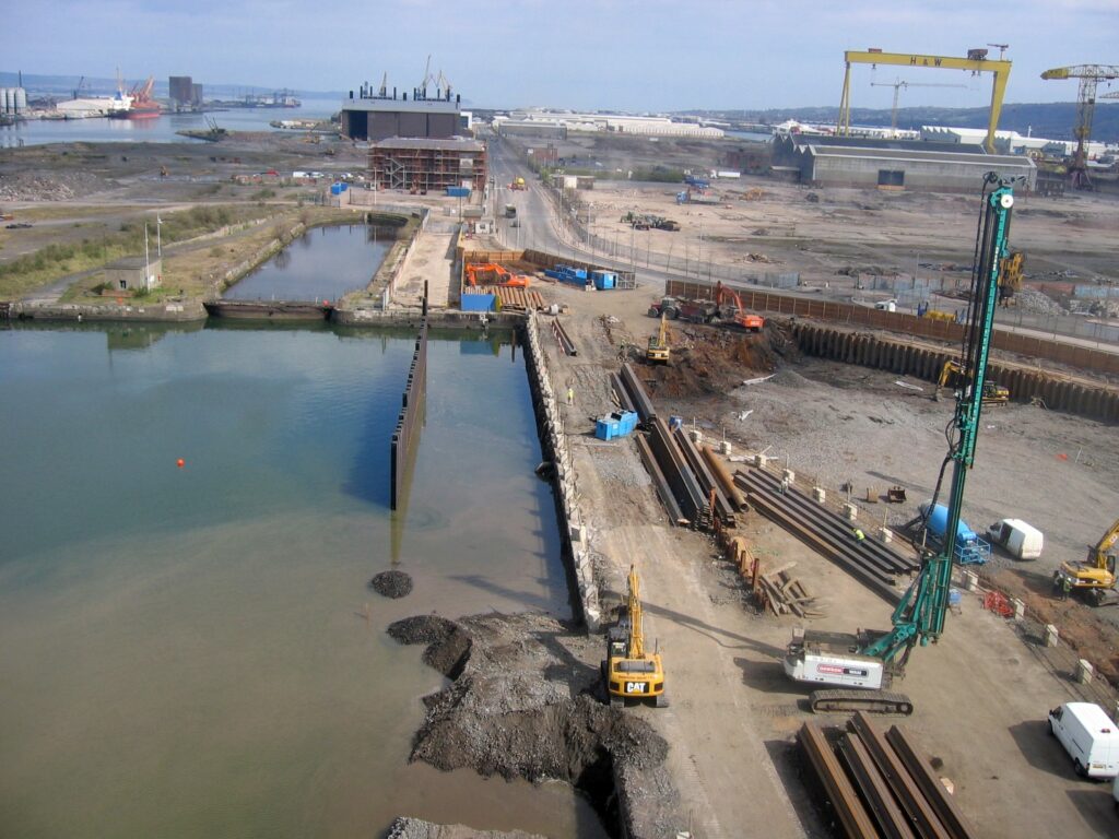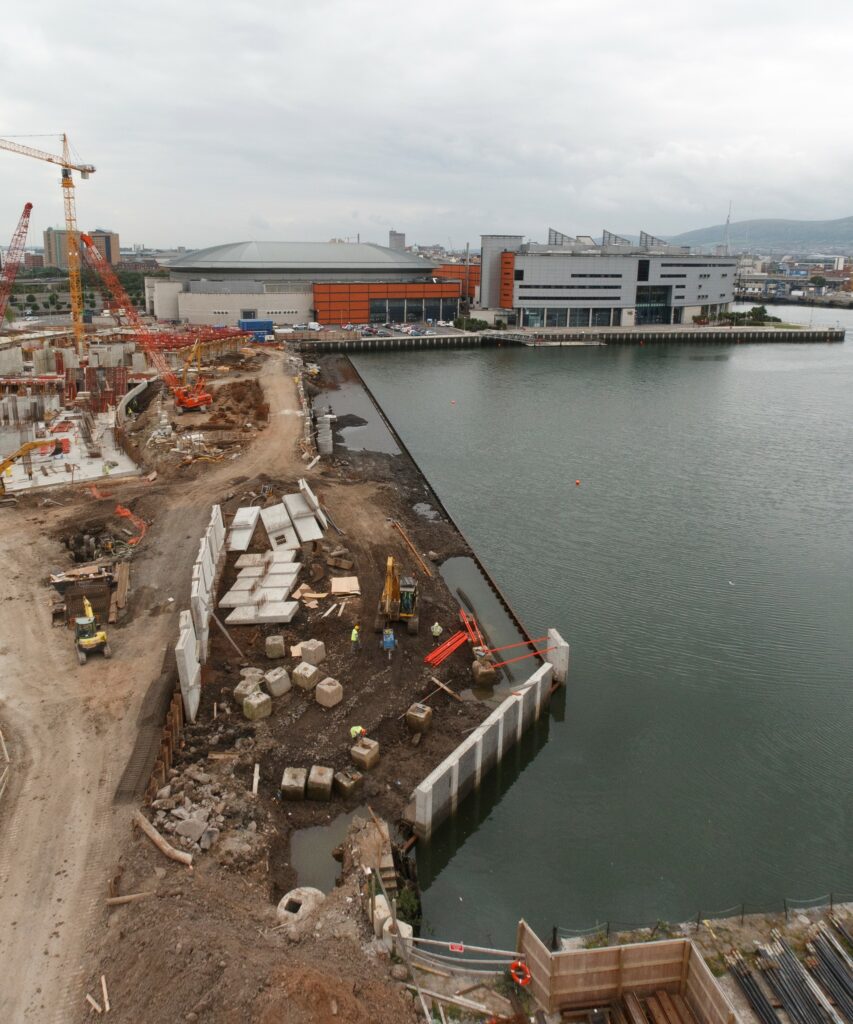 The East Quay Wall forms the frontage of the ARC (Abercorn Residential Complex) on to the Abercorn Basin of the River Lagan tidal reach, and launched the first stage of the prestigious Titanic Quarter Project at Queen’s Island, Belfast. The work was programmed to be carried out in parallel with the construction of the basement for the ARC Residential Complex.