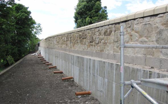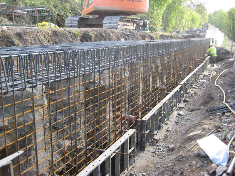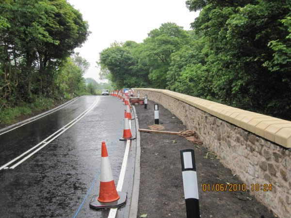 The road was constructed on a steep embankment prone to subsidence/slippage and was in danger of failing. DAWSON-WAM submitted an alternative tender proposal to install 600mm diameter contiguous piles, 8m in length, socketed a minimum of 2.1m into the underlying basalt and sandstone strata to retain and strengthen the road. A reinforced concrete capping beam was constructed on top of the contiguous piled wall with a 1.5m high masonry stone wall to form a crash barrier. Additional works included the installation of drainage to enable the passage of groundwater through the contiguous piled wall to prevent surcharge loading, together with the re-surfacing of approximately 0.5km of carriageway and associated landscaping.