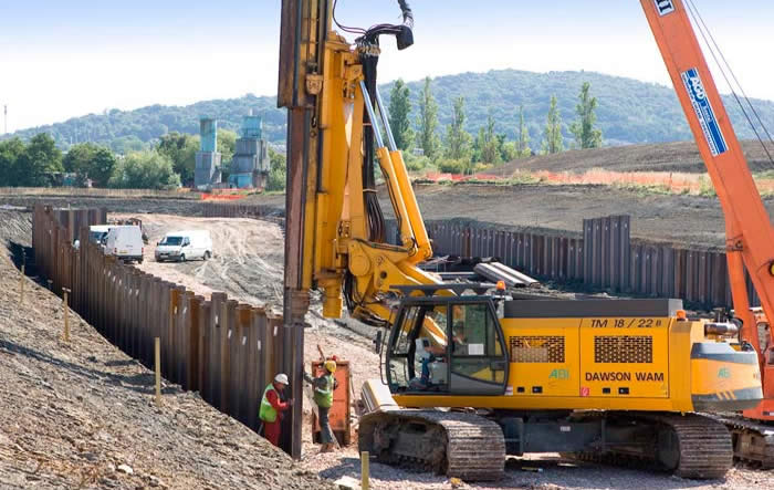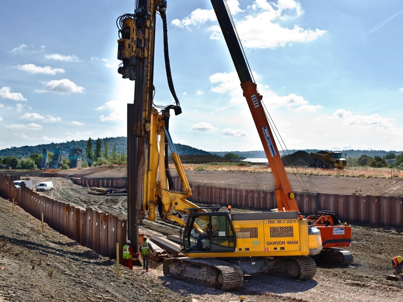 Installation into the very stiff Lias clays and mudstone soils of this region was carried out using one of DAWSON-WAM’s fleet of powerful telescopic 22m Leader rigs enabling the canal walls to be constructed in less than four weeks.