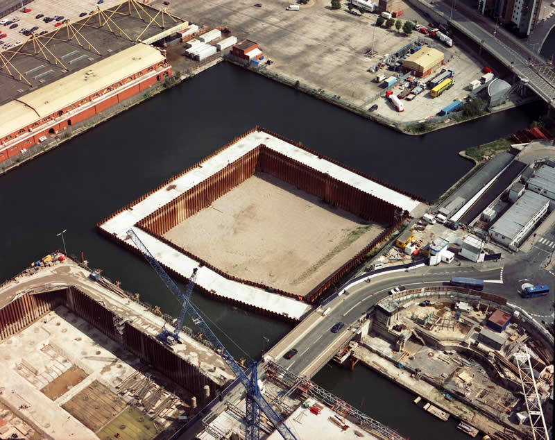 The construction in standing water, some 10 metres deep, of a 10 metre wide free-standing twin wall cellular tied sheet pile cofferdam, to allow the construction of a 6,400 square metre basement to a new high rise building in West Dock, Canary Wharf, London.