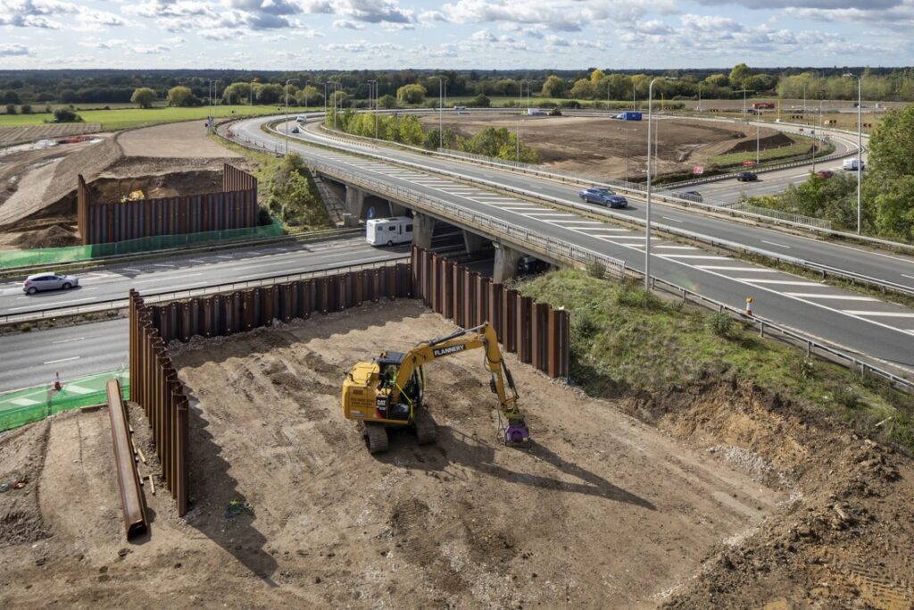 The ensuing period of summer 2020- summer 2021 has involved the installation of permanent sheet piles walls between Jct 8/9 to Jct 3. This has involved a lot of continued collaborative working to identify and adapt the best solutions for BBV due to the large number of embankments, restricting the onsite working width of the platforms.
