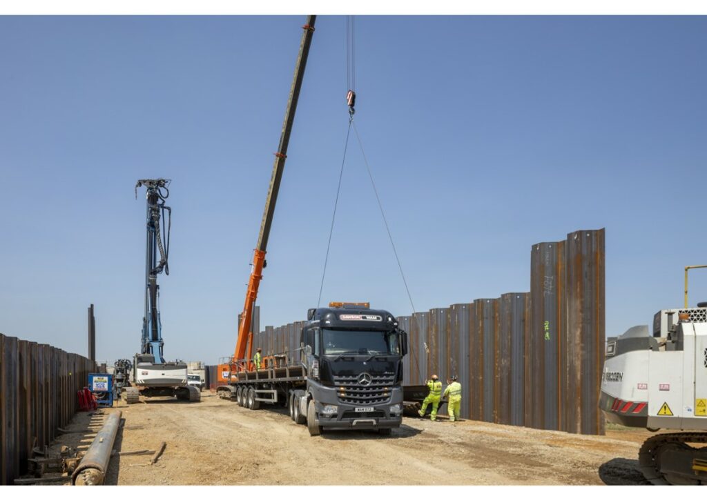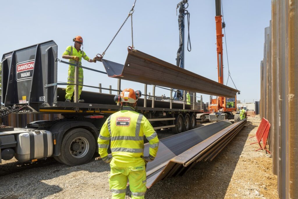 Sheet piles were delivered to site in a just in time basis throughout this project. Piles were ordered from supplier as per design and delivered to DAWSON-WAM’s 13 acre Bedfordshire yard where they were stored until required. Having the benefit of a storage facility allowed for a greater control over sheet piles and benefited the collaborative design approach which was taken throughout the scheme in order to save costs and mitigate material wastage.