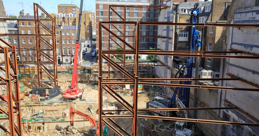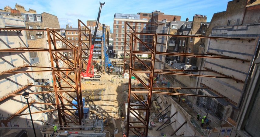 The existing basement covered the full extent of the site footprint, approximately 45m by 55m, which was split over 2 levels with the original building being supported on a raft foundation. The site was bounded on the East and West by two adjacent buildings whose gables were supported within the site by façade retention towers. To the North and South the site was bounded by busy roads.
