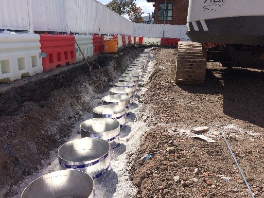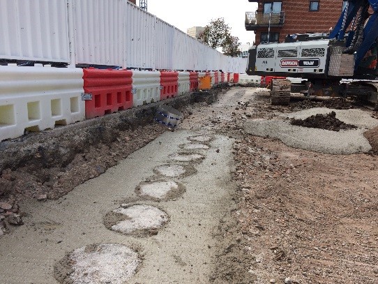 DAWSON-WAM introduced a new innovative method to install the guidewall for the 630mm diameter contiguous piles. Cardboard column formers with a diameter of 610mm, 5mm wall thickness, cut to a length of 350mm and installed using an offset line reference and string line. The cardboard column formers when placed, were filled with sand/dust before a reinforced concrete beam was poured either side to set them in place. Piles were then installed through the formers with the guidewall holding the casing and auger in position.