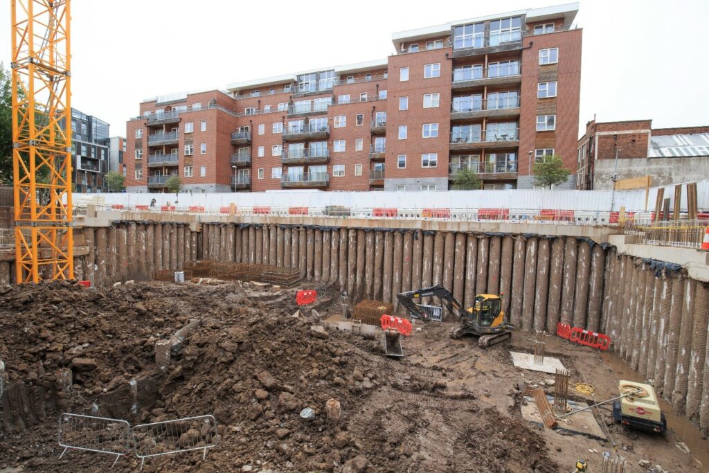 Ground conditions consisted of sandy, gravelly clay which lead to a weak sandstone courtesy of the Chester pebble bed formation. For construction the site was split into two levels, both containing 630mm dia. contiguous piles and 450mm dia load bearing piles. The bulk dig of the basement provided retaining heights up to 7m, show casing the capabilities of the contiguous piled wall.