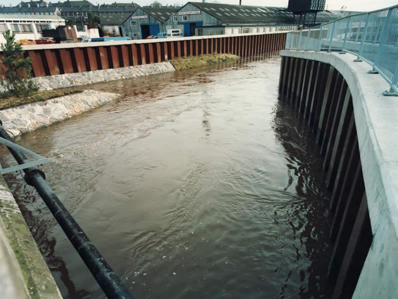 The supply and driving of some 1,350 tonnes of steel sheet piling in flood walls to both banks, and the construction of earth embankments totalling some 12,000 cu.metres including over 7,000 cu.metres of imported clay fill, to contain the watercourse as it passed through both residential and industrial areas.