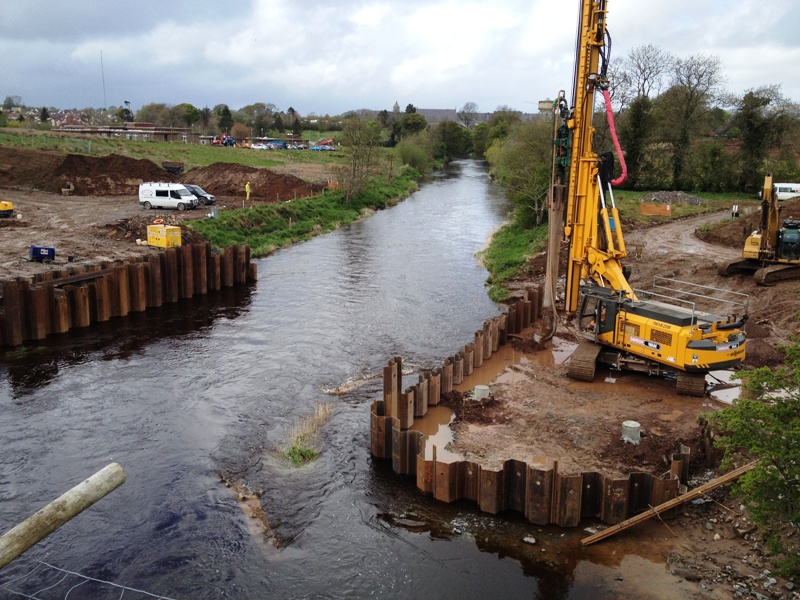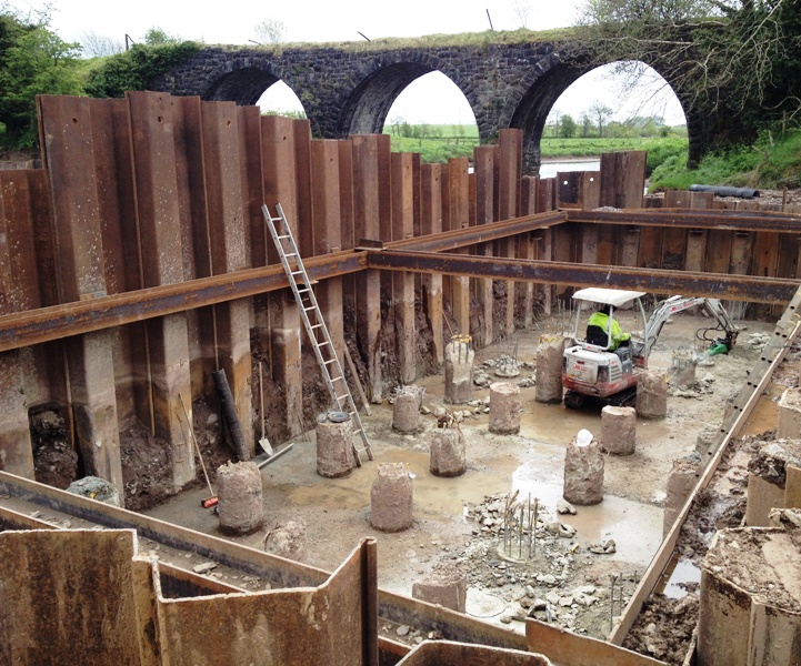 The project involved the installation of load bearing piles for two bridge abutments and two piers. The abutments were located on the existing banks of the river while the piers where located at the waters edge. As a result the two piers had to be steel sheet piled to provide a water cut off and enable the formation of a piling platform. On completion of the cofferdams the piling rig was able to track into the cofferdam from the landside and install the load bearing piles. Once the cofferdams were piled they were excavated to a depth of 2m prior to the installation of a frame. Once propped the cofferdams were excavated to formation level and the piles broken down ready for the construction of the RC pier.