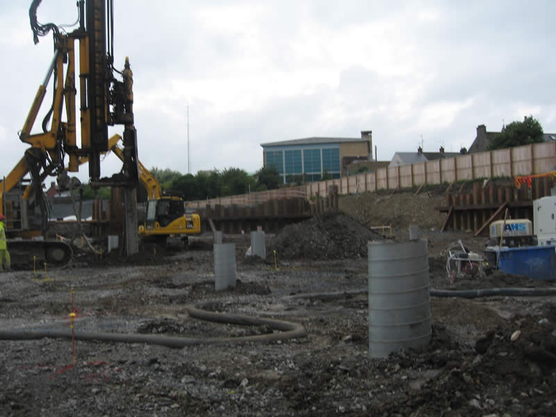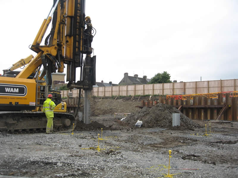 350 No. 450mm diameter cast in-situ augered piles were installed at depths of up to 15m together with pile caps and ground beams to form the foundations for the new facility. The works also included the construction of a new car park using some 36,000m2 of geogrid and 20,000m3 of stone fill. Ancillary works included but were not limited to the construction of 2No. 3m diameter 8m deep pumping stations together with approximately 1.5km of drainage and pumping mains.